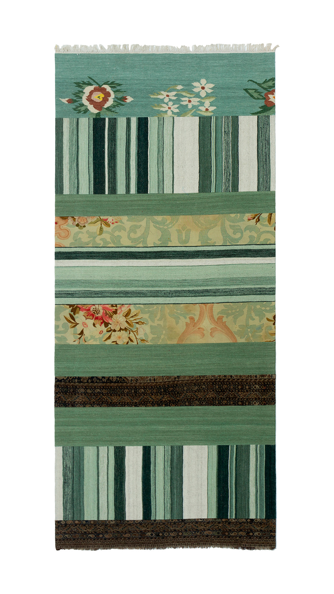 O Goltchin são pecas criadas com fragmentos de tapetes de varias procedências (Nepal, Índia, Ira, etc.) e períodos (antigos e novos). Todos os Goltchins são criados no ateliê da by Kamy, pelas mãos de talentosos artesoes que combinam e mesclam esses diferentes fragmentos construindo uma nova peca, um novo tapete único com muita historia.