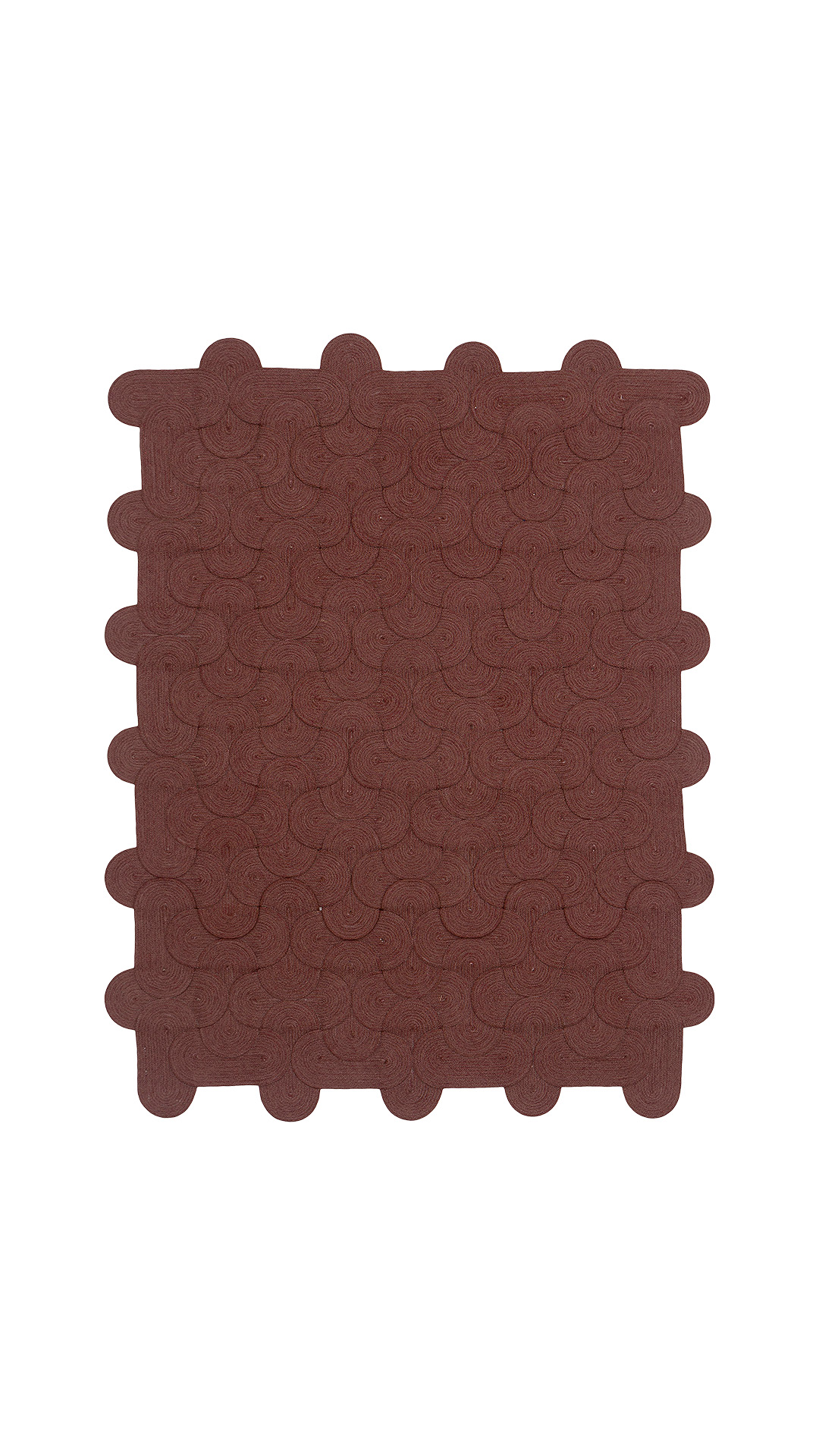 A matéria-prima das pecas e a corda náutica, que quando finalizadas e trancadas, são entrelaçadas manualmente para montar a peca toda com contornos arredondados e intermitentes que invadem a linearidade das bordas. A sinuosidade da tecitura e valorizada no jogo de luz e sombra que suscita movimento.